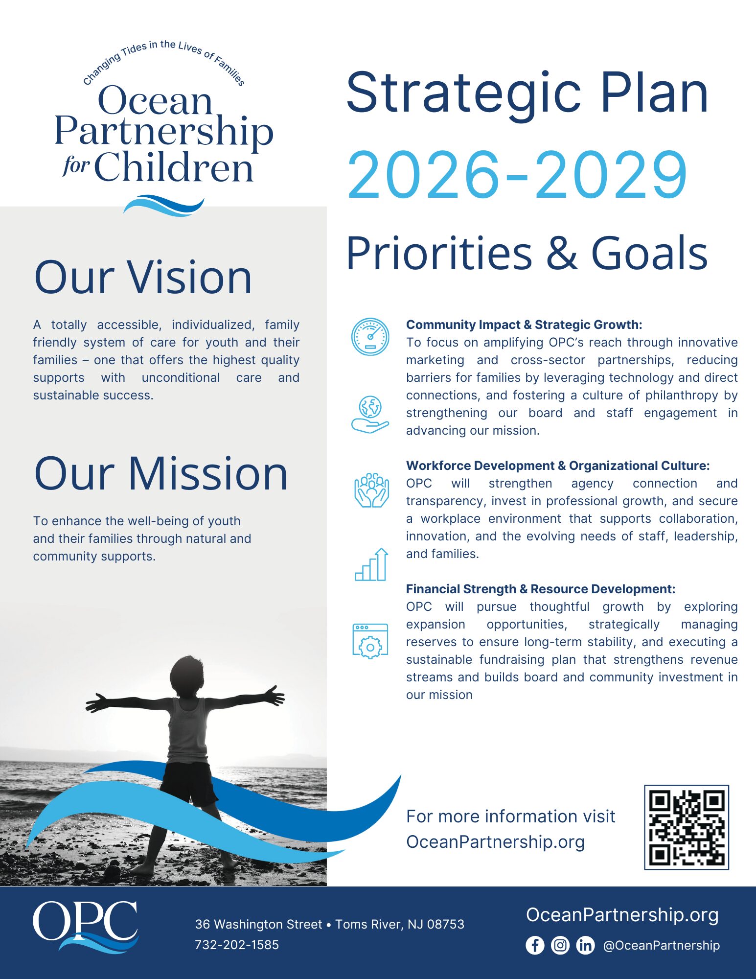 Ocean Partnership for Children’s 2026-2029 Strategic Plan priorities and goals include Community Impact & Strategic Growth, Workforce Development & Organizational Culture, and Financial Strength & Resource Development.
